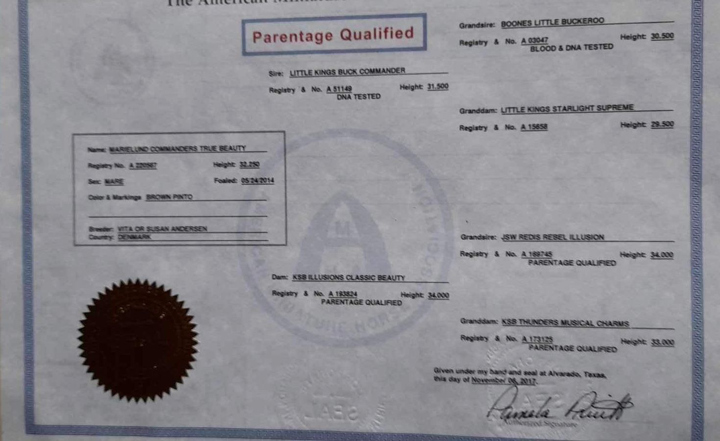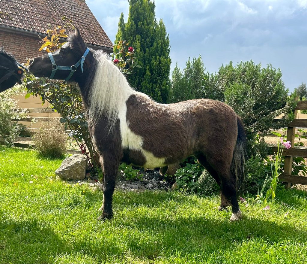 Jument Pie Noire née le 24/05/2014. Jument trés facile qui a participée à des concours quand elle avait 1 an. 32,25 inches , Père : Little Kings Buck Commander . Mère : KSB Illusions Classic Beauty. Elle peut être saillie par l’étalon de votre choix pour un poulain en 2025.